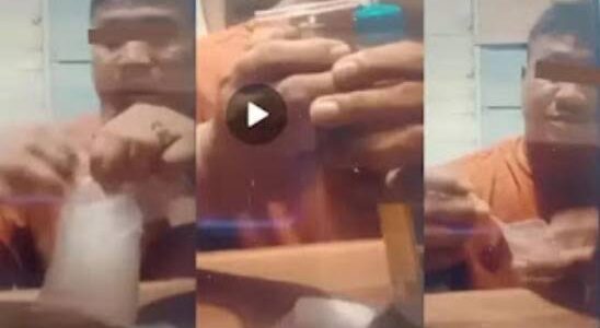 Di menit berikutnya, dengan menggunakan sebuah benda menyerupai pipet, pria tersebut terlihat “menyekop” benda dari dalam plastik transparan berbeda, dan meletakkannya di kaca bong (alat penghisap sabu).